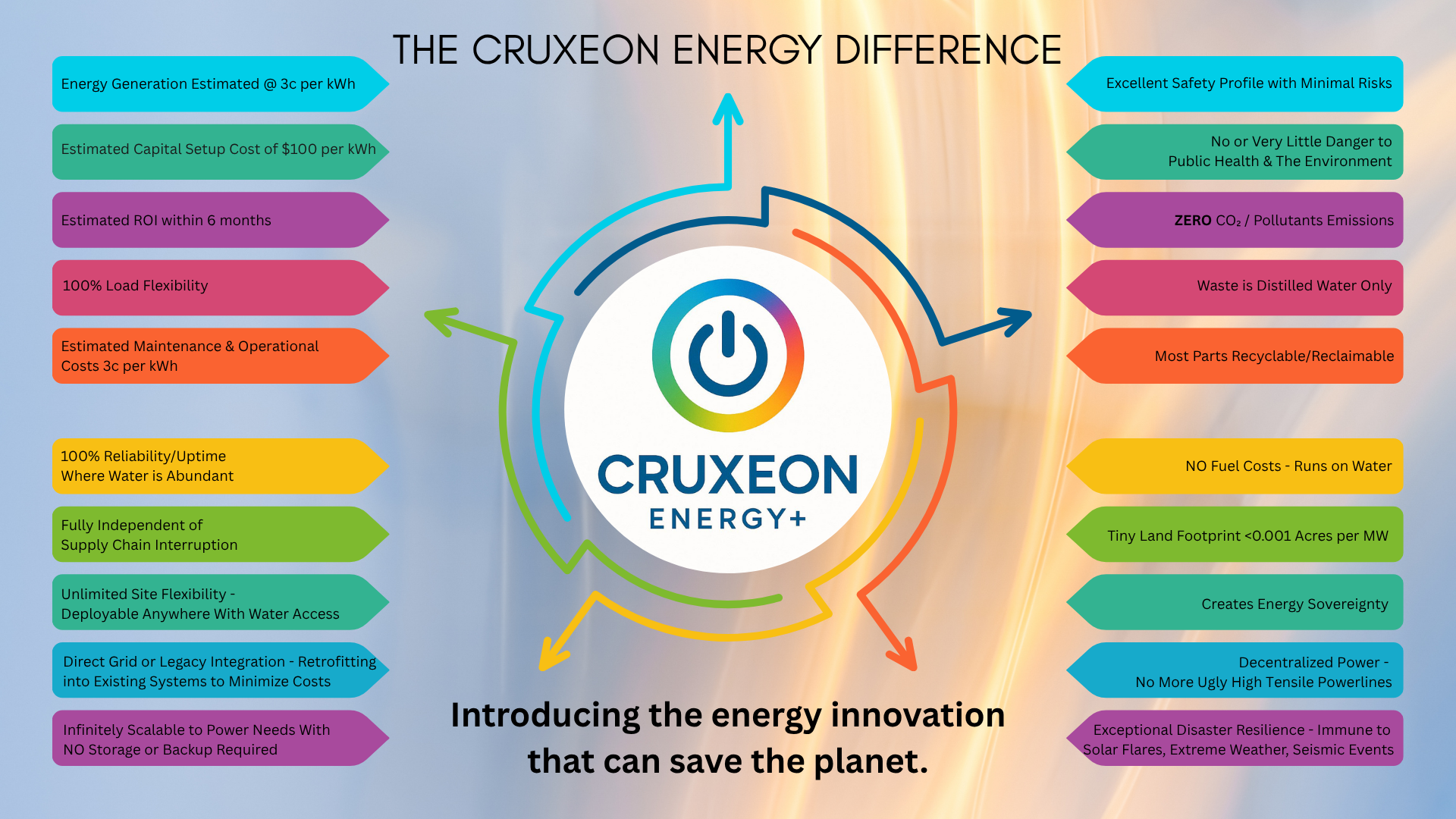 At Cruxeon Energy+, we are revolutionizing the energy landscape with our groundbreaking water-powered energy generators. Our mission is to provide sustainable, scalable, and clean energy solutions - removing the reliance on petrochemicals to fuel our growing energy needs. With a commitment to innovation and environmental responsibility, we are shaping the future of energy. Together, we can create a world powered by renewable resources.
